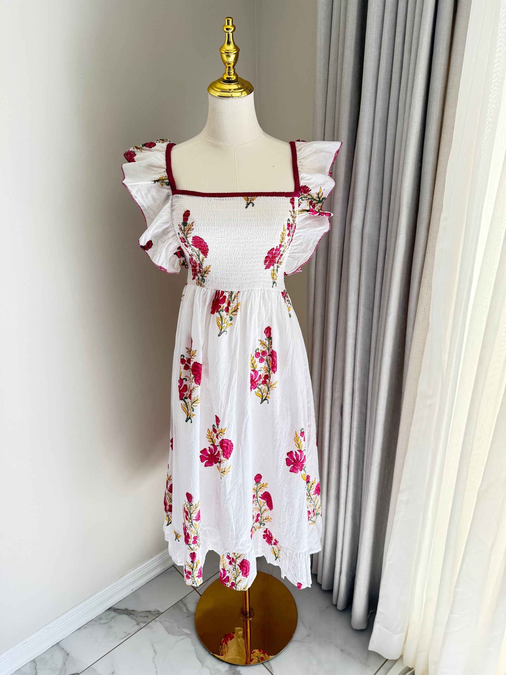 Introducing our exquisite Ethereal Blossom Dress, adorned with a striking hand block print of bold and beautiful red pink floral motifs.