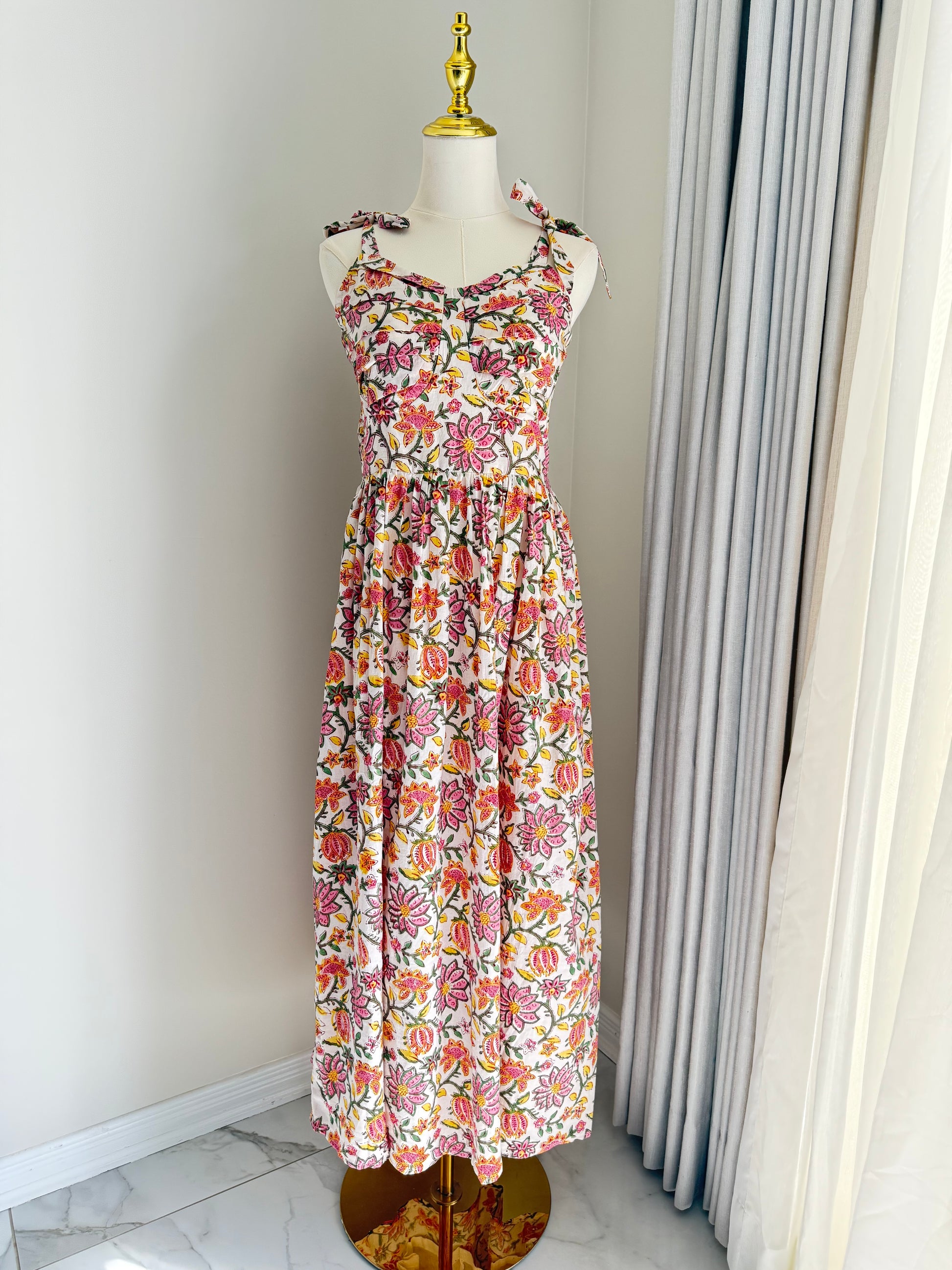 Crafted from 100% toxic-free cotton, this dreamy midi dress combines comfort with conscious fashion. Featuring artisanal hand block prints and a soft floral pattern, it’s a celebration of timeless craftsmanship. The fairytale-inspired design is complete with charming bow-tie sleeves and a graceful flared silhouette—perfect for garden strolls, brunch dates, or magical evenings. Ethically made, effortlessly beautiful.